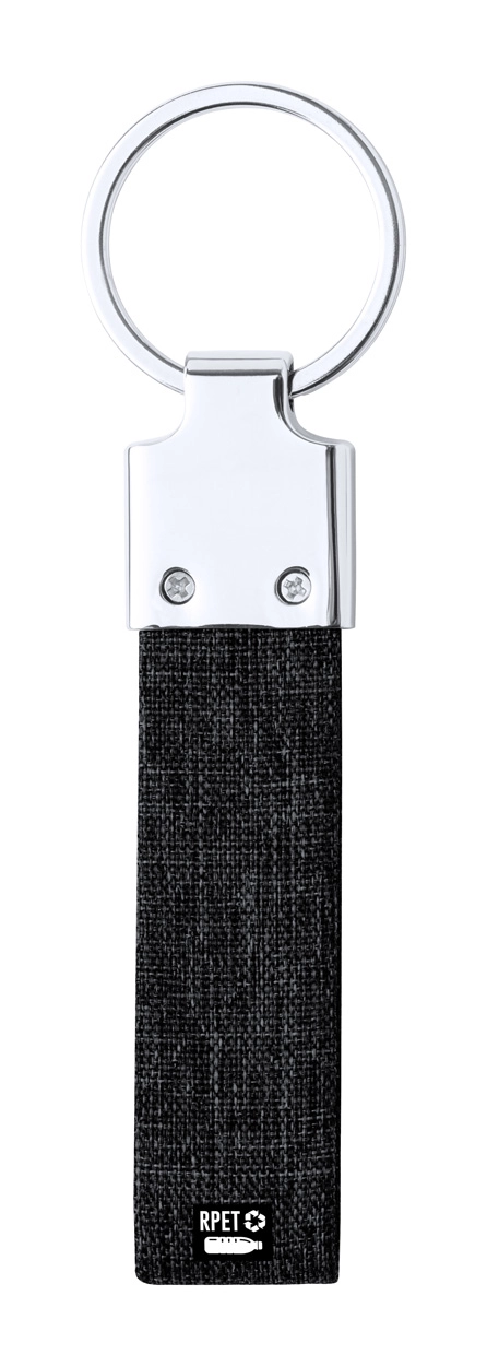 Metalowy brelok z poliestrowym paskiem RPET.