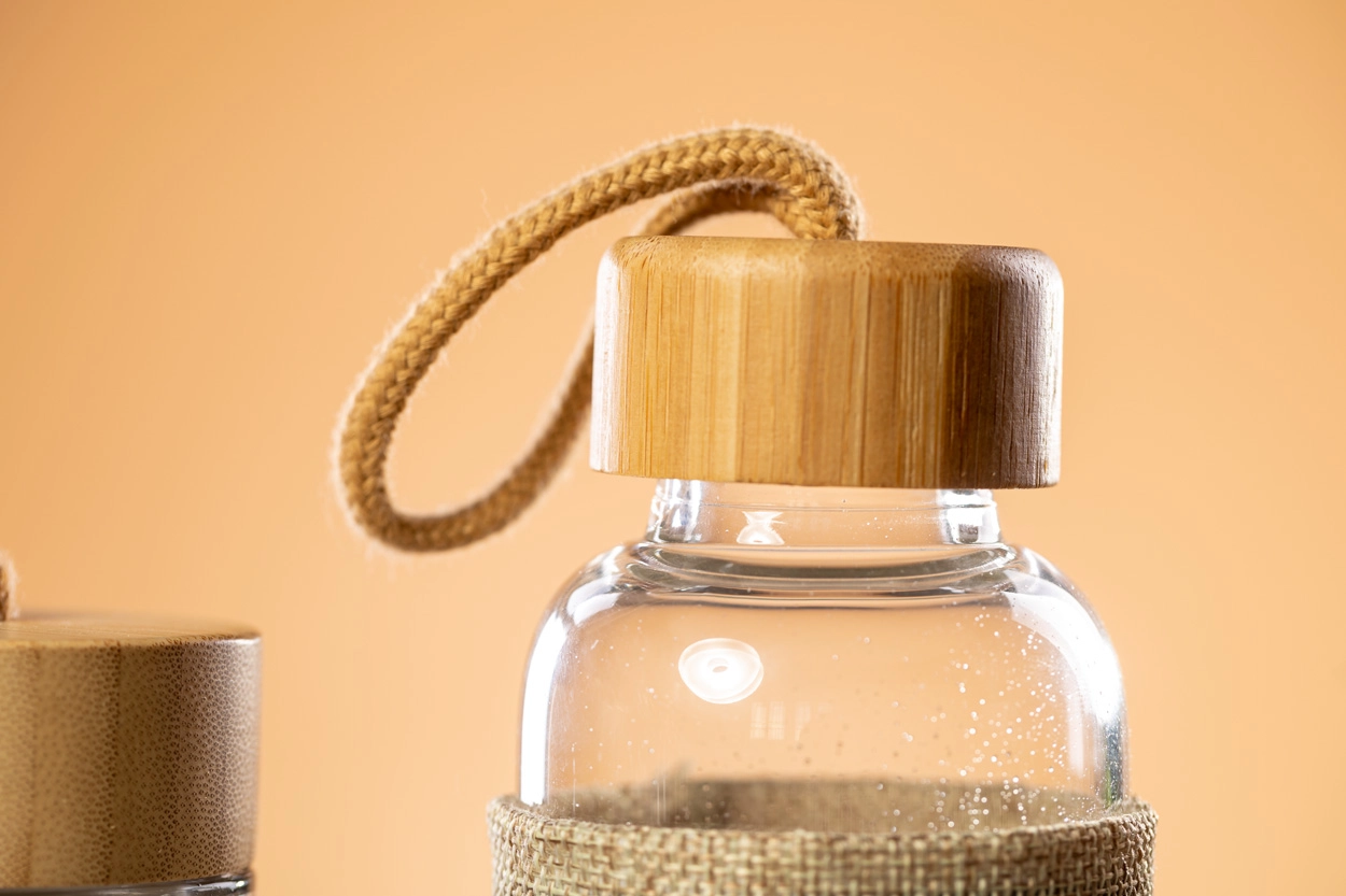 Szklana butelka sportowa z bambusową pokrywką i paskiem do noszenia oraz pokrowcem poliestrowym w naturalnym kolorze. 500 ml.