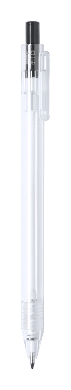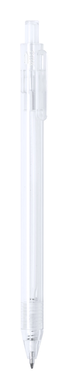 Transparentny, plastikowy długopis z RPET z kolorowym przyciskiem. Z niebieskim wkładem.