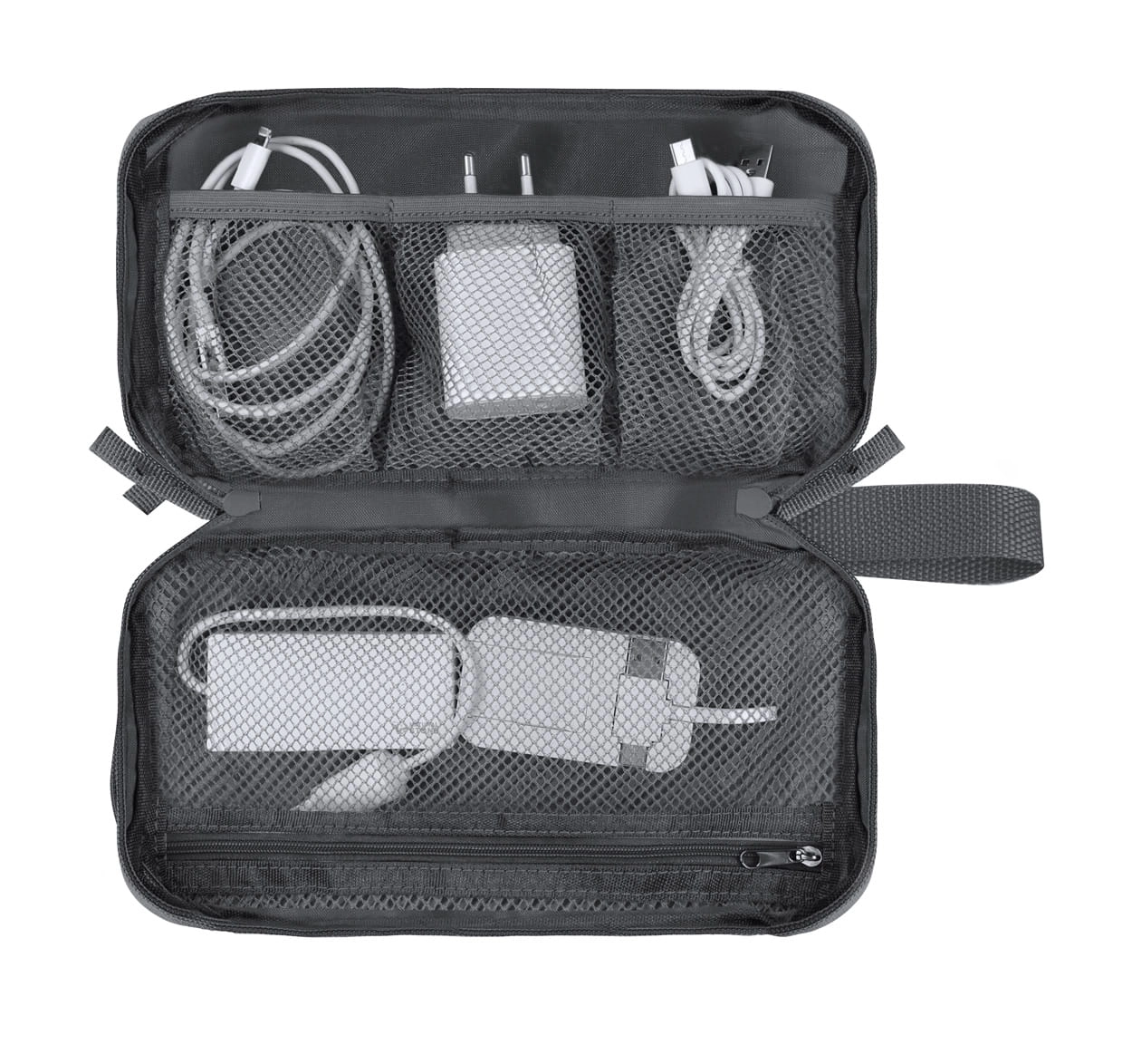 Zapinany na zamek organizer do kabli z poliestru RPET. Poliester 900D RPET z wyraźną etykietą RPET.