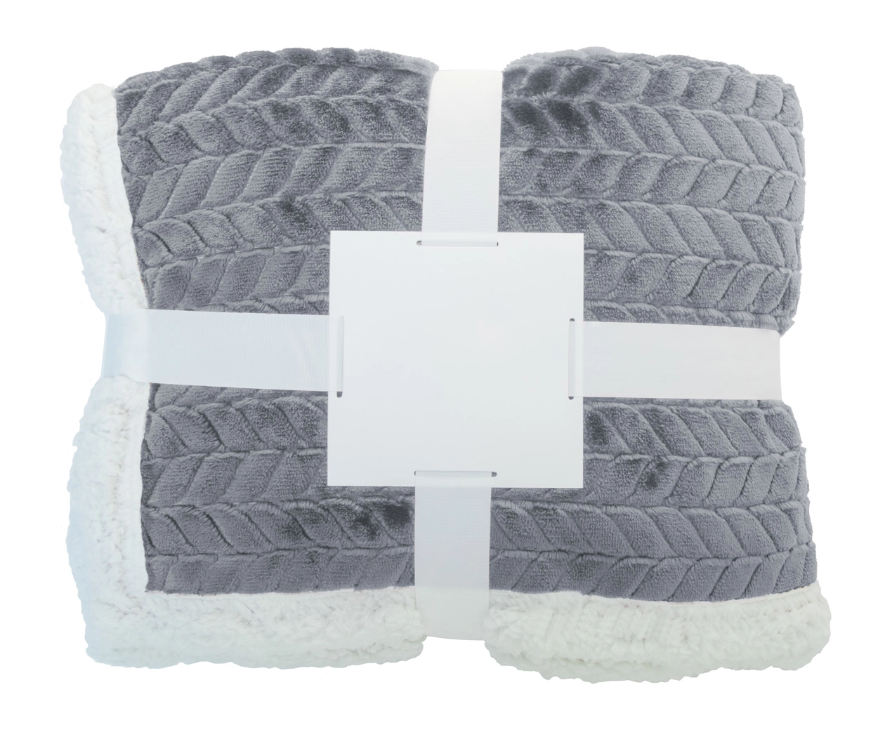 Dwuwarstwowy koc RPET z żakardowym wzorem. Z polarem flanelowym RPET 240 g/m? i podszewką z polaru sherpa RPET 210 g/m?. Owinięty wstążką i kartą do nadruku.