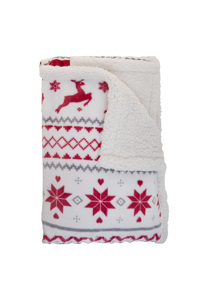 Dwuwarstwowy koc świąteczny RPET z flanelowym polarem RPET o gramaturze 230 g/m? i podszewką z polaru sherpa RPET o gramaturze 210 g/m?. Owinięty wstążką i kartą do nadruku.