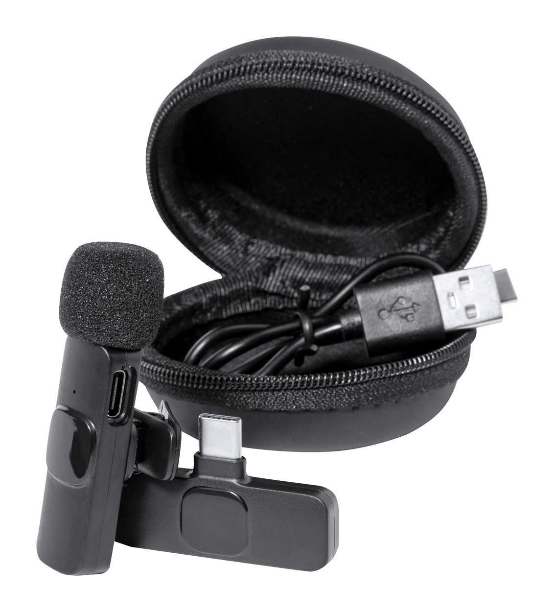Bezprzewodowy mikrofon mobilny z wbudowanym akumulatorem (45 mAh) i odbiornikiem USB-C. W etui zapinanym na zamek. W zestawie kabel do ładowania USB.