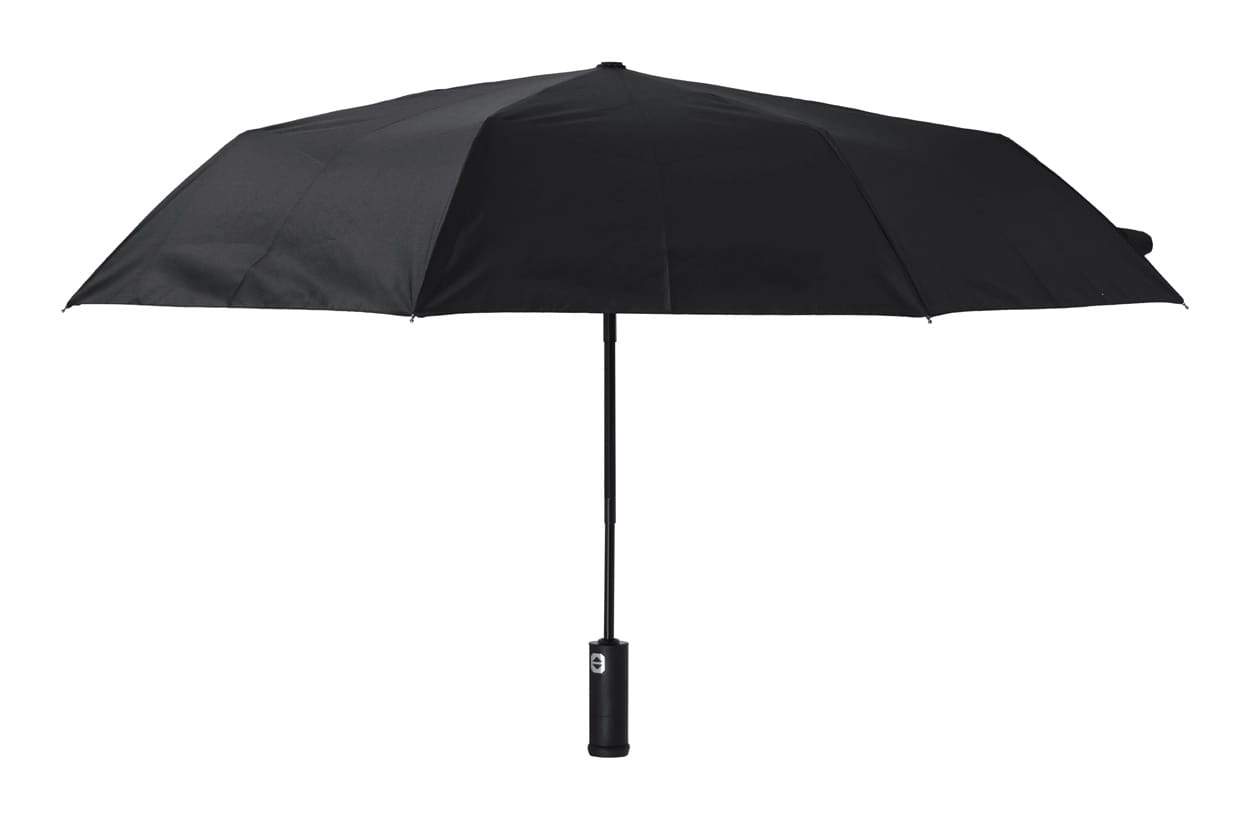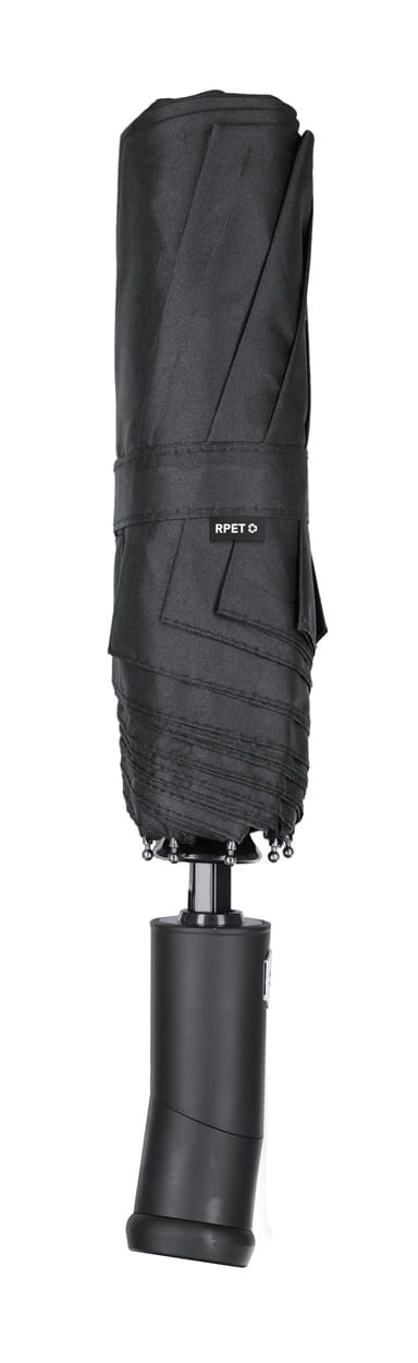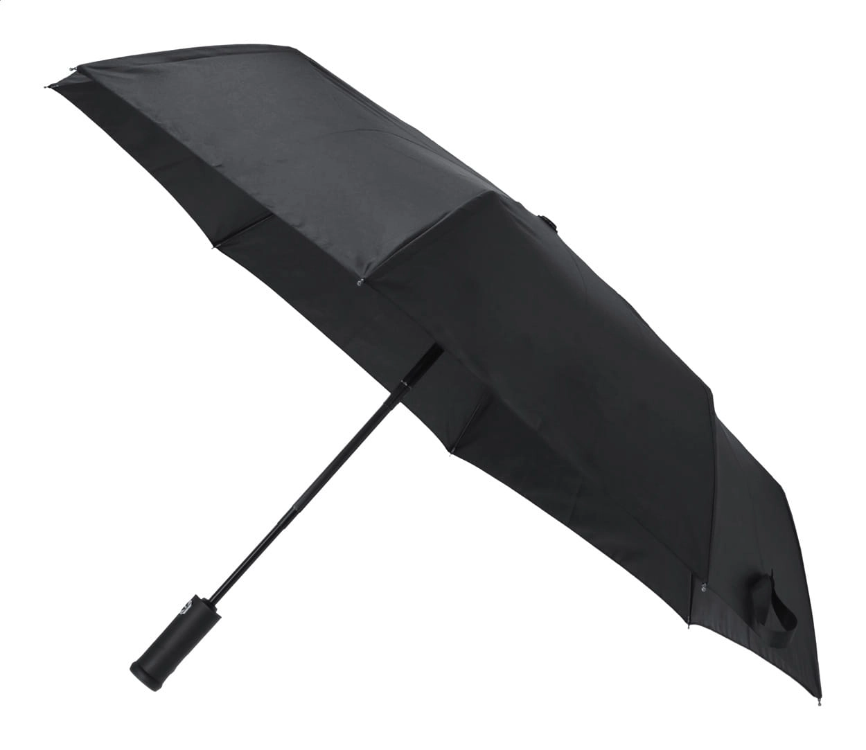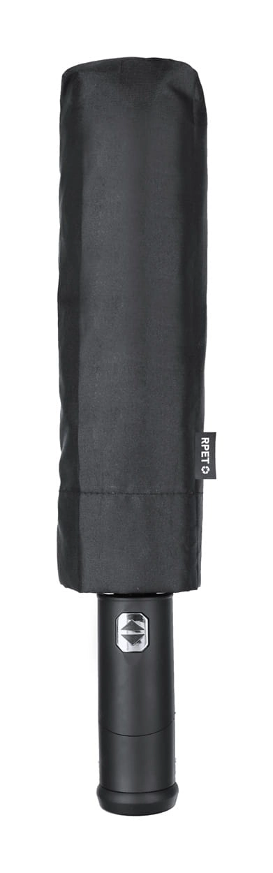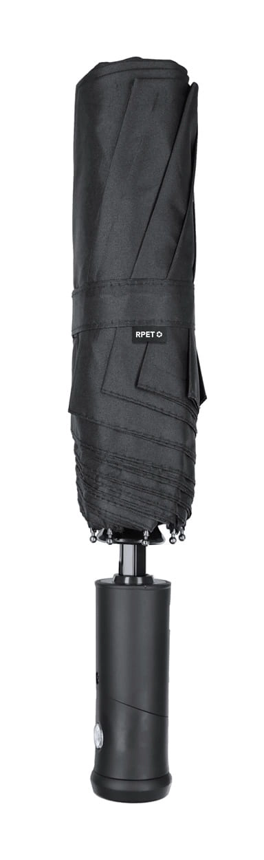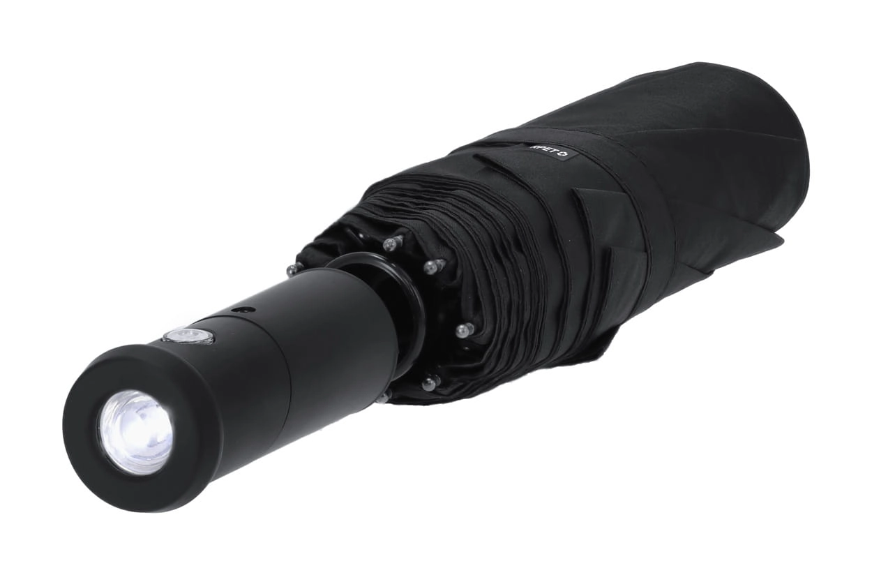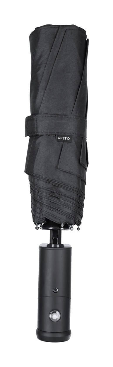 W pełni automatyczny (otwieranie/zamykanie), wiatroszczelny parasol składany z 8 panelami w etui. Z metalową ramą, żebrami z włókna szklanego i plastikowym uchwytem z wbudowaną latarką z 1 diodą LED. Zawiera baterie guzikowe. Pongee 190T RPET. Z charakterystyczną metką RPET.