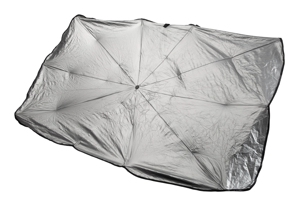 Składana, ręczna parasolka samochodowa na przednią szybę z metalową ramą. W etui poliestrowym.