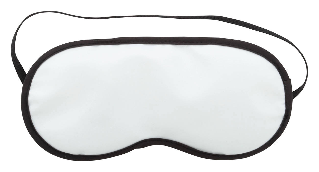 Personalizowana podróżna maska na oczy z poliestru (140 g/m2) wyściełana pianką, z czarną obwolutą i tasiemką. Z nadrukiem sublimacyjnym na całości. Min. ilość: 100szt.