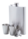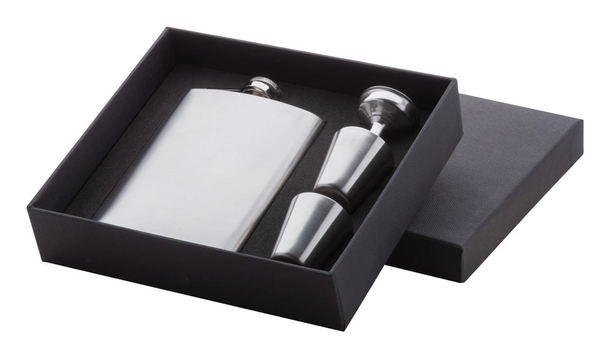 Piersiówka ze stali nierdzewnej w zestawie z dwoma kieliszkami i lejkiem. 230ml. W czarnym pudełku.