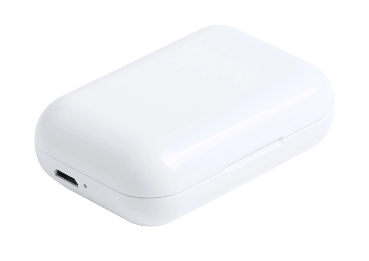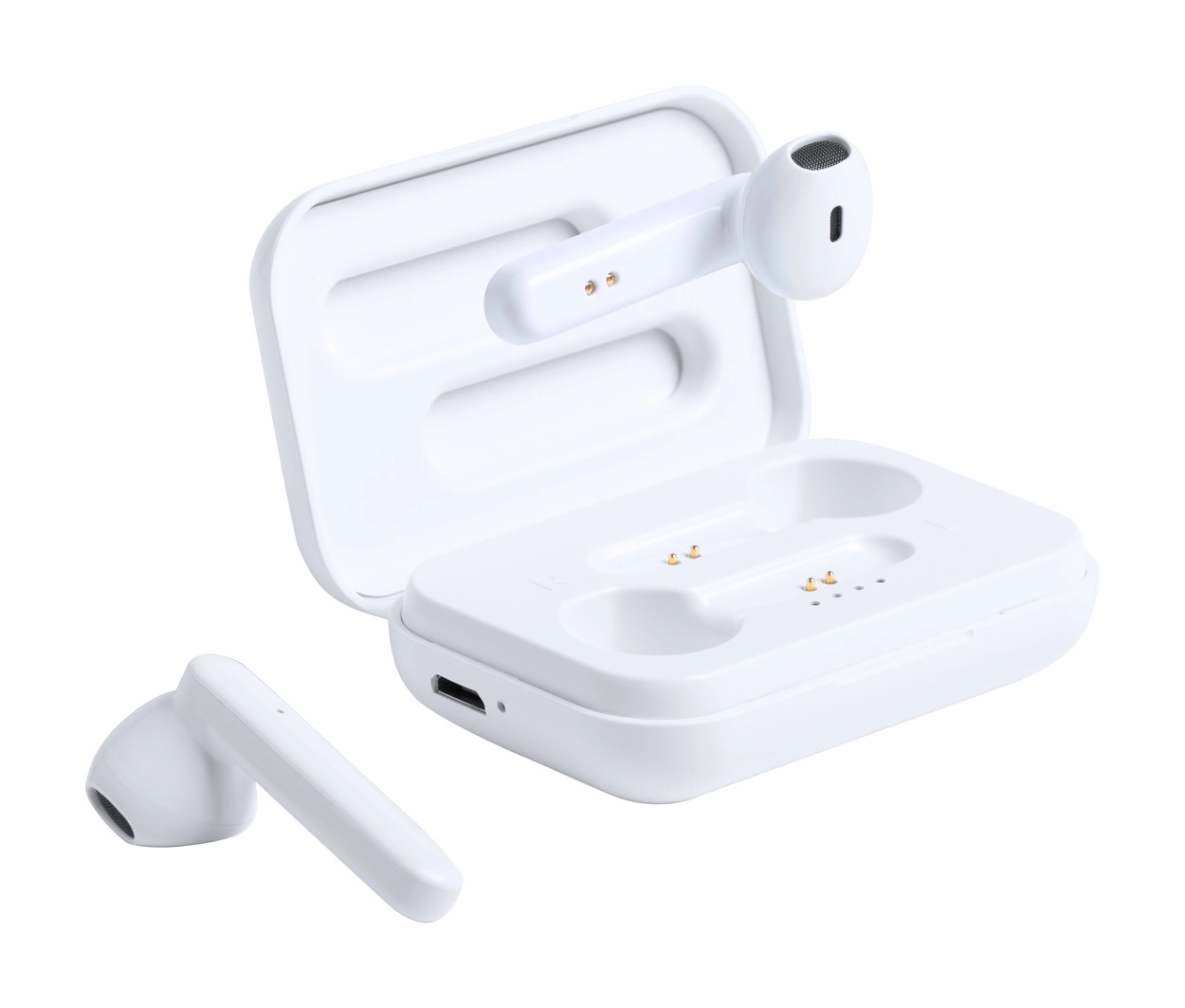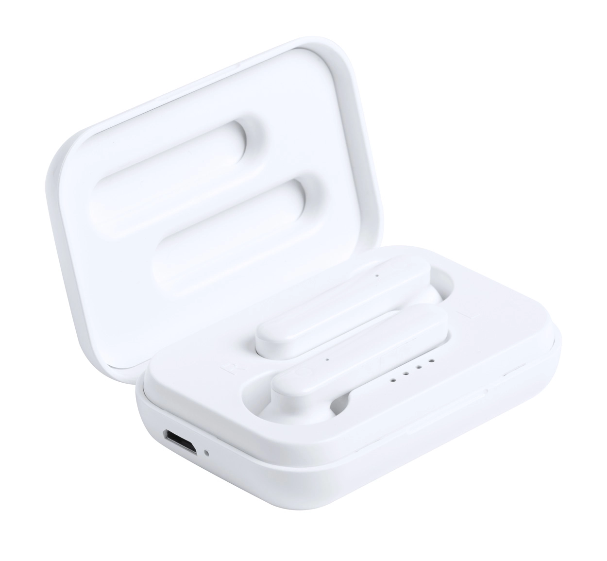 Bezprzewodowe słuchawki bluetooth z funkcją rozmów głosowych i plastikowym etui ładującym. Zawiera kabel USB.