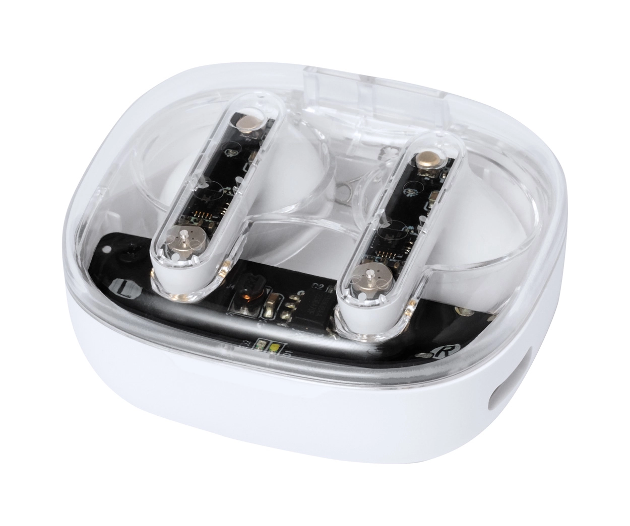 Półprzezroczyste, bezprzewodowe słuchawki bluetooth z widocznymi elementami elektronicznymi i funkcją głośnomówiącą. W półprzezroczystym plastikowym etui ładującym. Zawiera kabel USB.