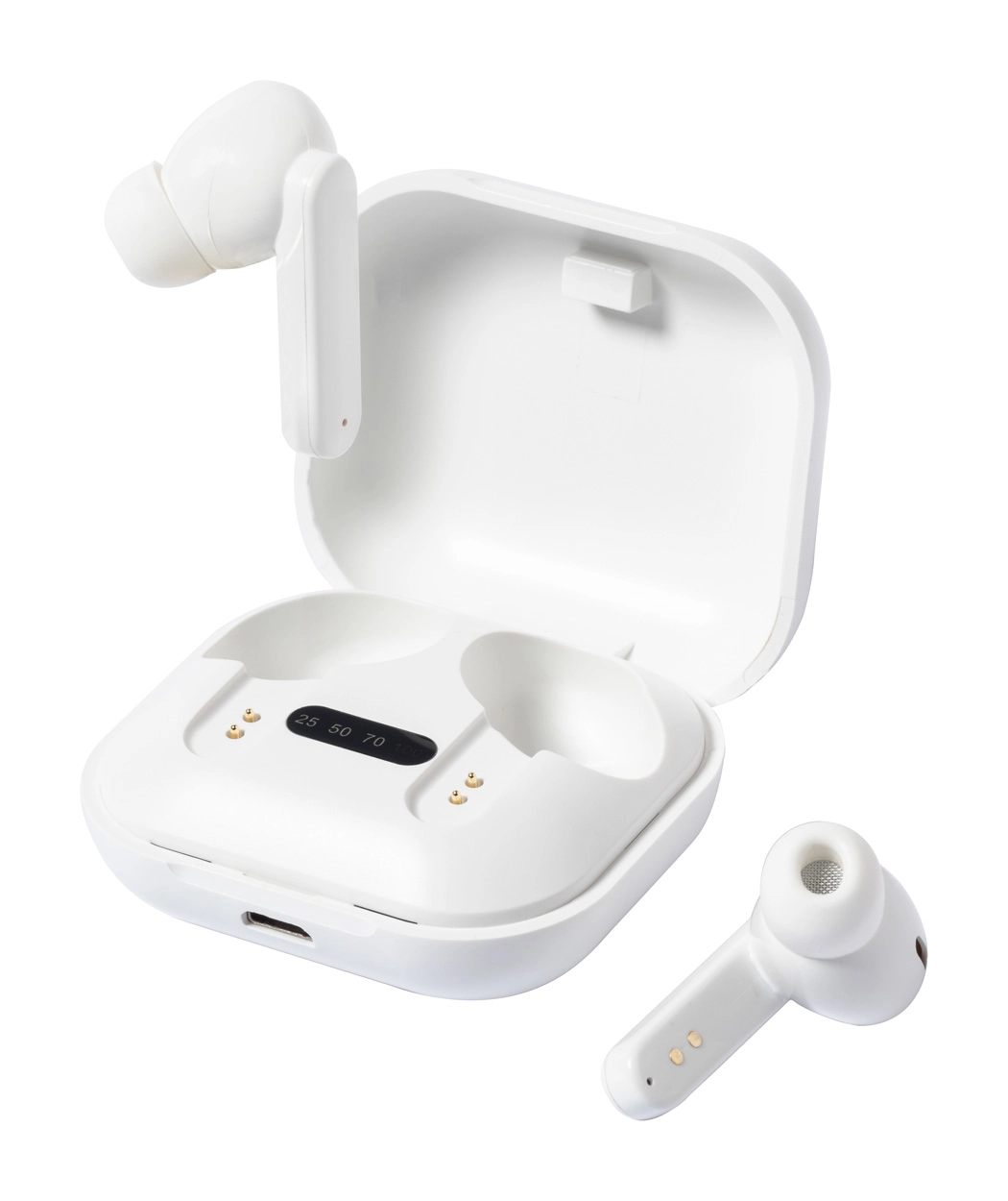 Bezprzewodowe słuchawki Bluetooth z ABS z recyklingu z funkcją głośnomówiącą. W etui ładującym. W zestawie kabel USB.