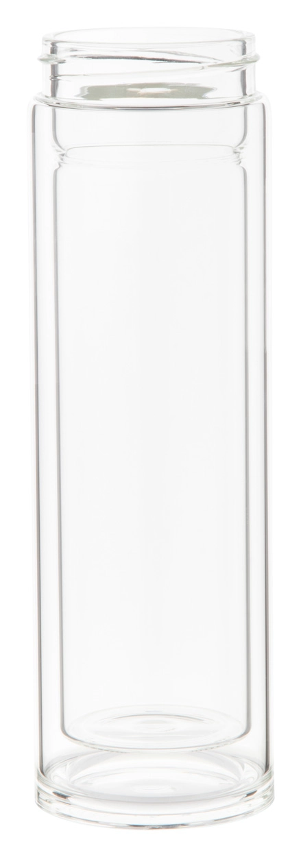 Butelka termiczna ze szkła borokrzemianowego z podwójnymi ściankami, zaparzaczem do herbaty i bambusową pokrywką. 420 ml.