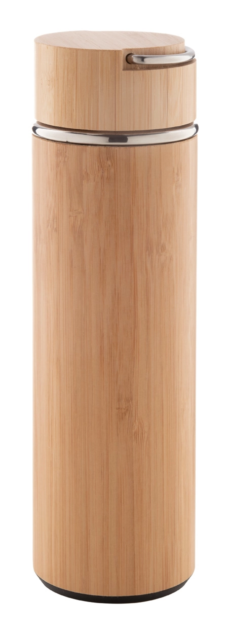 Termos z podwójnymi ściankami ze stali nierdzewnej i bambusa z zaparzaczem do herbaty i pokrywką z paskiem. 450 ml