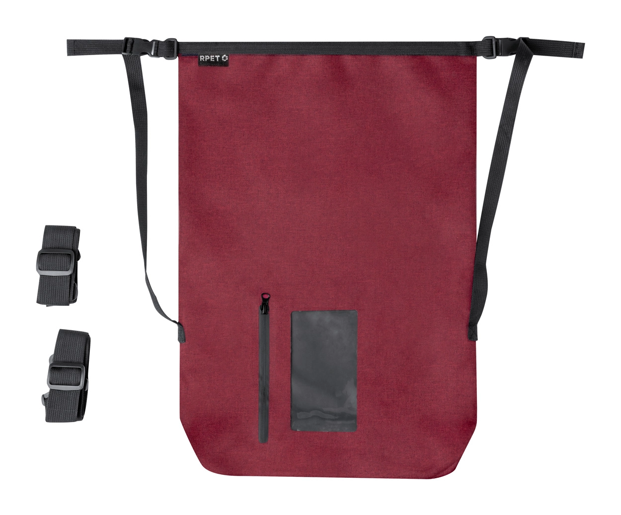 Wodoodporny plecak / torba wykonana z poliestru 300D RPET, z zapinaną na zamek kieszenią na ekran dotykowy. Z regulowanymi paskami. Pojemność: 25l.