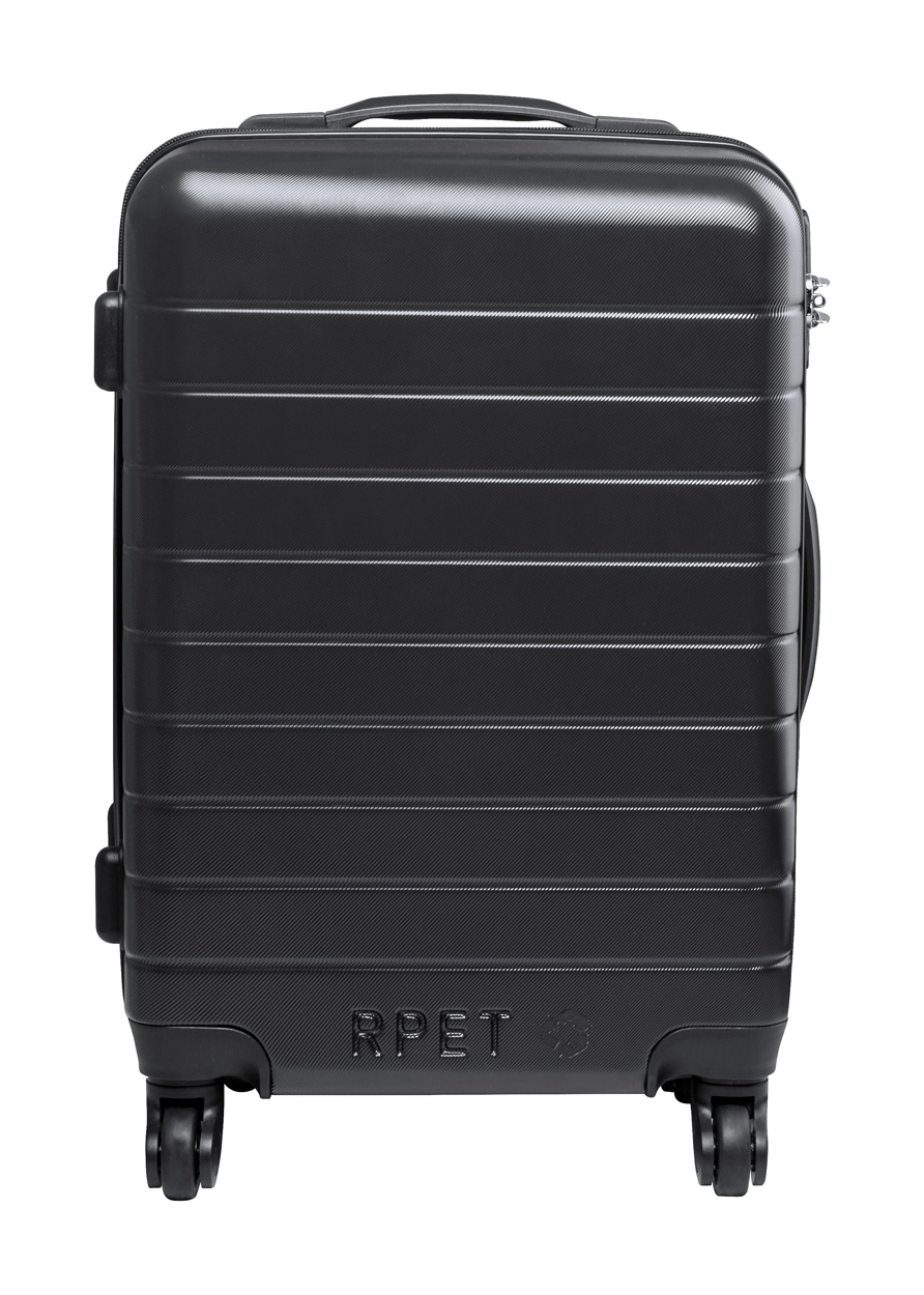 Plastikowa walizka na kółkach RPET z 4 podwójnymi kółkami, teleskopową rączką i zamkiem szyfrowym TSA. Z wewnętrzną podszewką RPET i elastycznymi paskami mocującymi. Z charakterystyczną metką RPET.