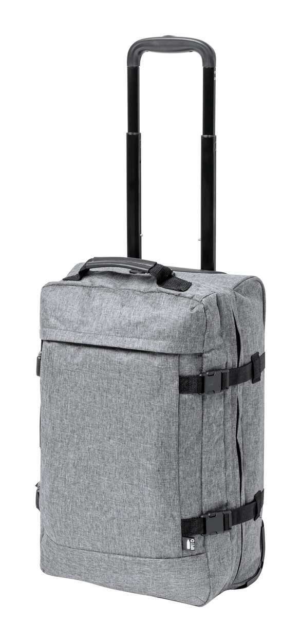 Torba/walizka na kółkach RPET z 2 kółkami, teleskopową rączką i zamkiem szyfrowym TSA. Poliester 300D RPET z charakterystyczną metką RPET.