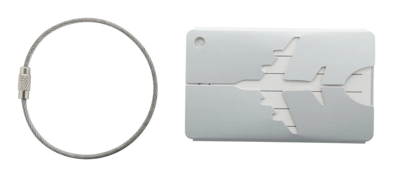 Aluminiowa zawieszka bagażowa z motywem samolotu i metalową linką.