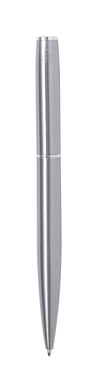 Zestaw długopisów ze stali nierdzewnej z recyklingu, składający się z długopisu z przekręcanym mechanizmem i pióra kulkowego z niebieskim wkładem. W pudełku upominkowym z naturalnego korka.